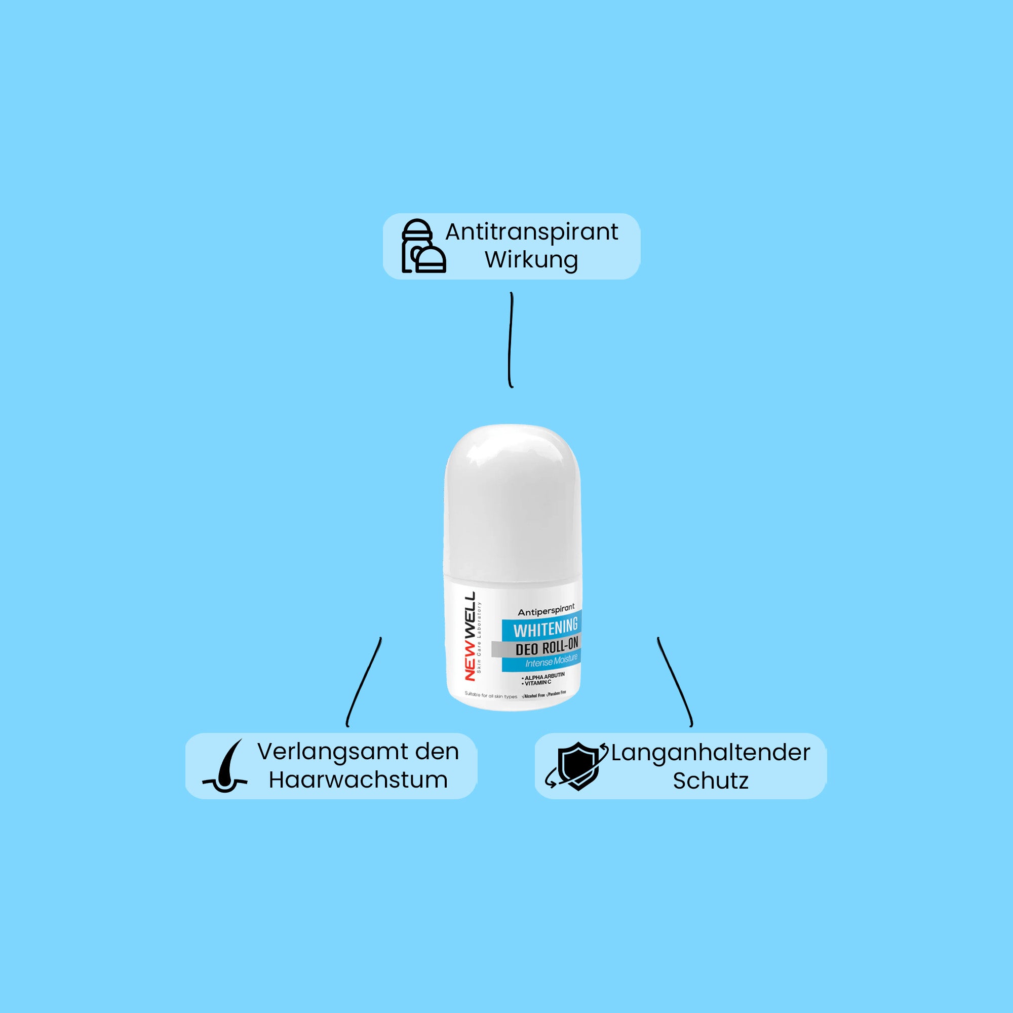 Schweißflecken und dunkle Achseln? Nicht mit uns! Der Aufhellende Anti-Transpirant Roll-On gibt dir den Rundumschutz, den du brauchst und ist dein täglicher Begleiter, der dich zuverlässig vor Schweiß und unangenehmen Geruch schützt. Während Alpha-Arbutin und Vitamin C dunkle Flecken unter den Achseln aufhellen und Verfärbungen reduzieren, schützt dich die schweißhemmende Formel den ganzen Tag lang. Geeignet für Frauen und Männer.