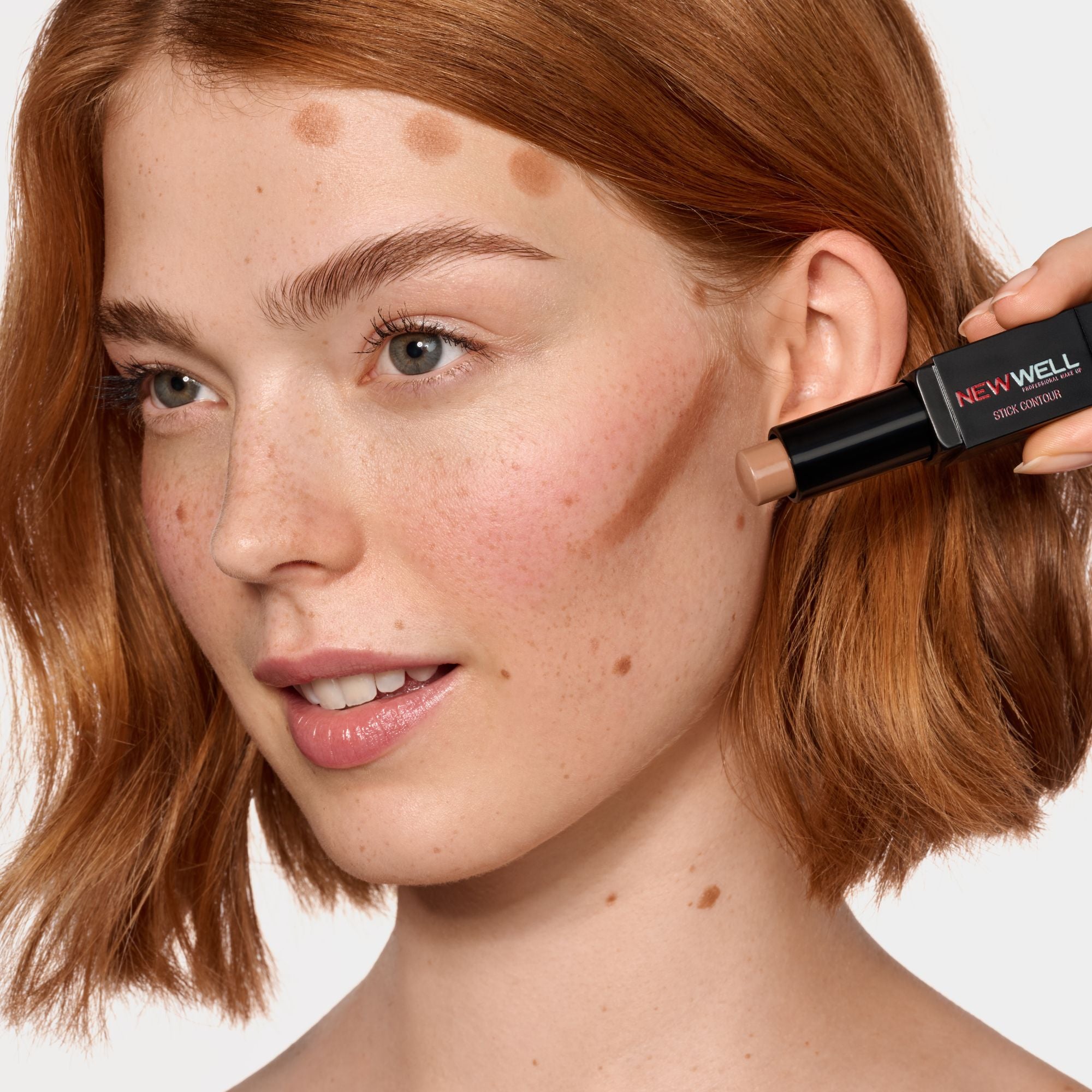 1. Nach dem Auftragen der Foundation, mit der dunklen Seite des Sticks Contour auf Wangenknochen, Stirn, Kinnlinie und Nase auftragen
