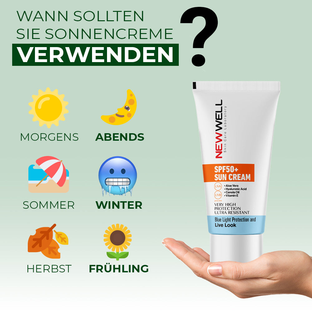 Ja, die Gesichts-Sonnencreme bietet Breitband-SPF50+ Schutz nicht nur gegen UVA und UVB, sondern auch gegen Blaulicht von Bildschirmen. Zusätzlich zu ihrem Schutz vor schädlichen Sonnenstrahlen enthält sie Inhaltsstoffe wie Karottenwurzelextrakt, B-Carotin und Calamin, die den Teint verschönern und dunklere Hautpartien energetisieren. Aloe Vera spendet Feuchtigkeit, und die leichte Textur sorgt dafür, dass die Creme sofort einzieht. Newwell präsentiert somit nicht nur einen Sonnenschutz, sondern eine All-in-One-Lösung – für Schutz, Pflege und strahlende Schönheit, einschließlich des Schutzes vor Blaulicht von Bildschirmen.
